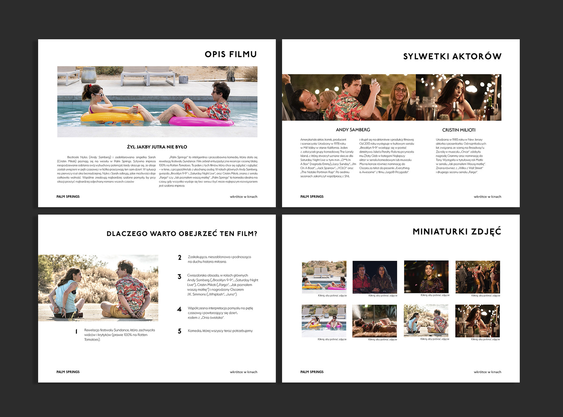 Do you want to present your film, screenplay, or promotion plan in a striking way? Whether you need it in print or digital form, I’m here to help. I have experience working with printing houses and a strong knowledge of the printing market in Poland. Dreaming of an elegant booklet or a small publication that stands out? Together, we’ll create the perfect print design – I’ll advise on paper selection and print enhancements to make your project shine. I’ll assist in creating brochures, catalogs, and leaflets that strengthen your promotion.